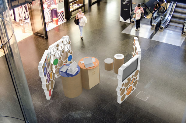 Thanks to the open nature of the panels, the space of the booth is not clearly defined. It merges with the environment and invites customers in. The stand is open and it allows